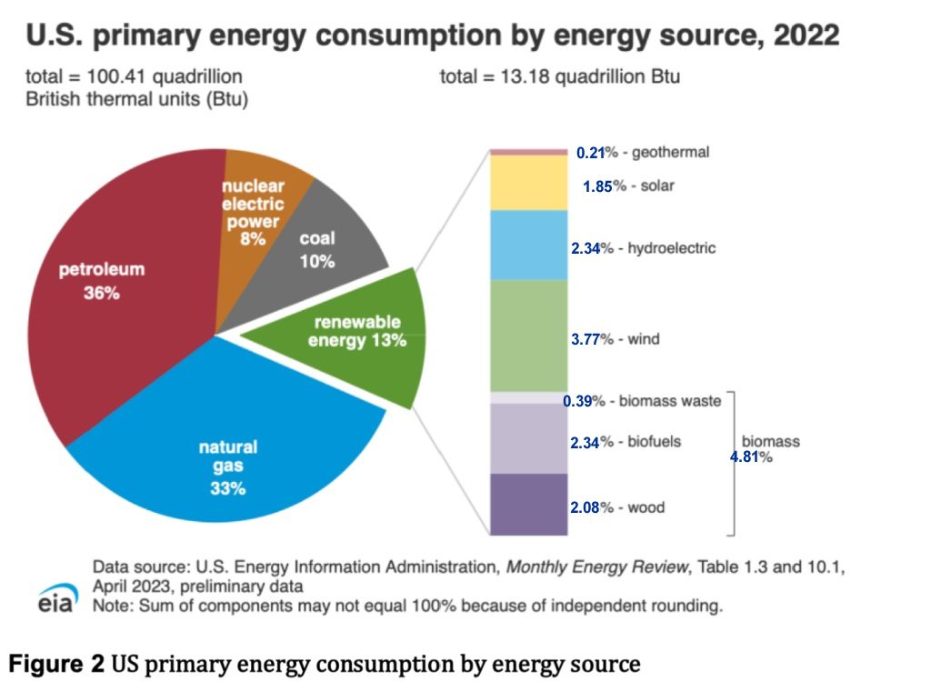 Advocates of renewable energy resources emphasize the apparent abundance of renewable energy emanating from the Sun, while neglecting the energy density reaching the Earth’s surface. Unsurprisingly, solar energy trails behind all other forms of renewable energy resource except geothermal (Figure 2). An often overlooked fact is that biomass is the largest segment of the renewable contribution satisfying energy consumption, and low-tech direct burning of wood is on par with heavily subsidized biofuels. This is even more pronounced in global energy consumption where the largest portion of the “renewable portfolio” comes from burning plant materials and animal waste.