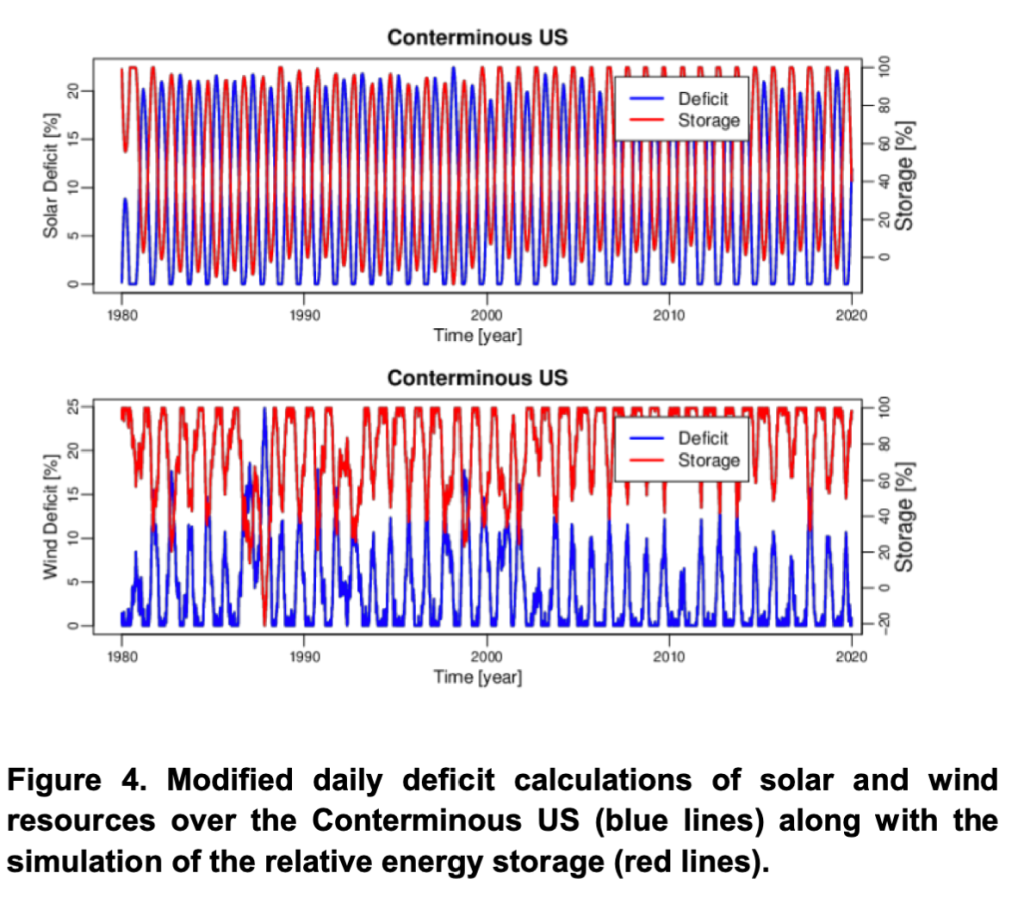 Figure 4 shows the daily cumulative energy deficit (blue line) arising from the power shortage from solar or wind that is depleted when excess power is available from these sources. The highest deficit during the analyzed period (1980-2019) is the energy storage capacity needed to weather out the highest supply deficit. The storage simulation on the same graph (red line on Figure 4) shows the state (in percent) of the storage assuming that the storage initially is filled up completely and depleted regularly during periods of energy deficit and restored when excess power is available from solar or wind.