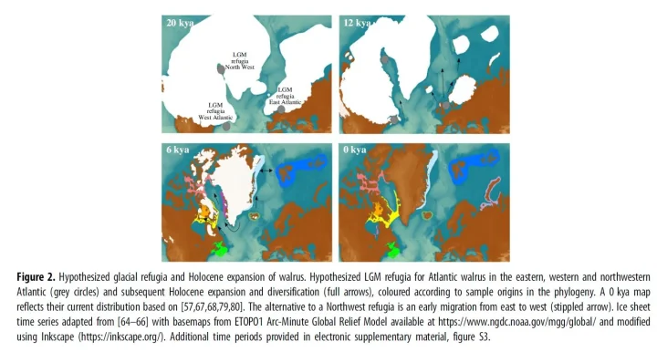 Ruiz-Puerta, E.J., Keighley, X., Desjardins, S.P.A., and 15 other authors. 2023. Holocence deglaciation drove rapid genetic diversification of Atlantic walrus. Proceedings of the Royal Society B 290: 20231349. https://doi.org/10.1098/rspb.2023.1349