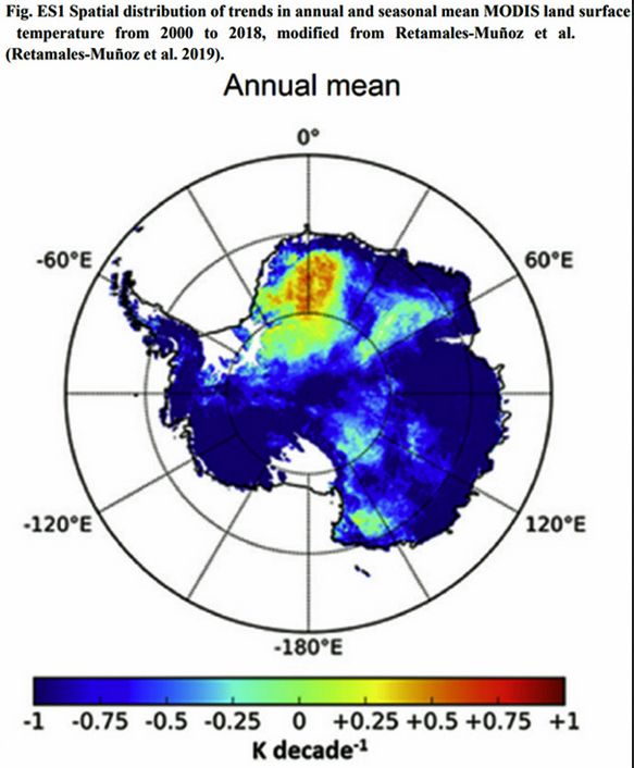 According to the results of Zhang et al., most of the Antarctic continent has cooled by more than 1°C in the last two decades. See, for example, the cooling trend of ~1 °C per decade for East Antarctica (2000 to 2018) shown here: