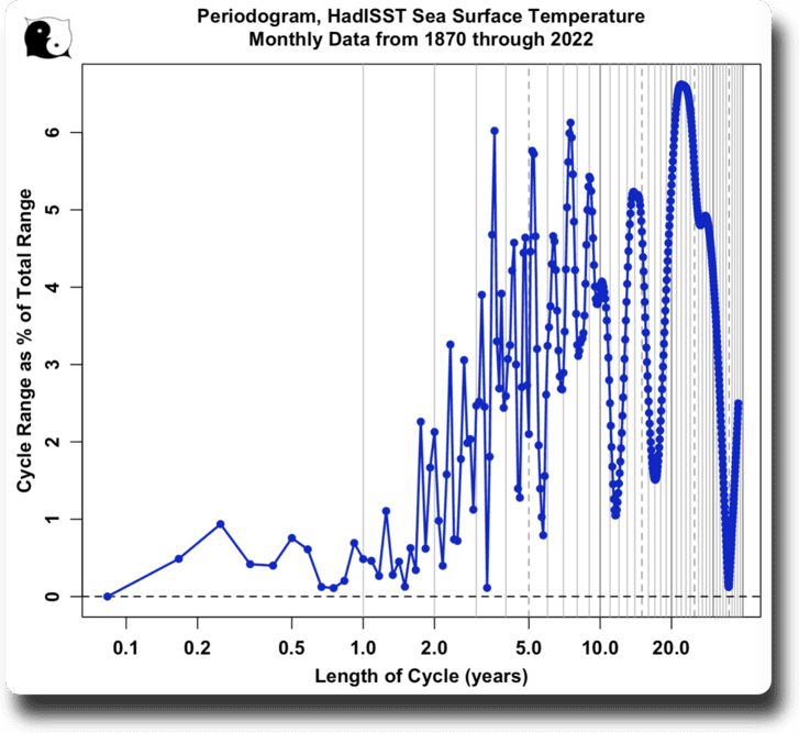 I tried to replicate that result using the HadISST sea surface temperature dataset. It covers the period from 1870 through 2022.