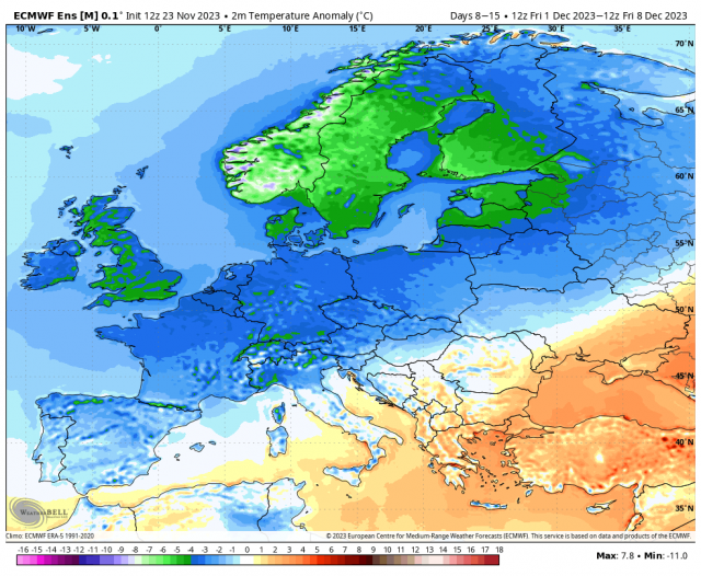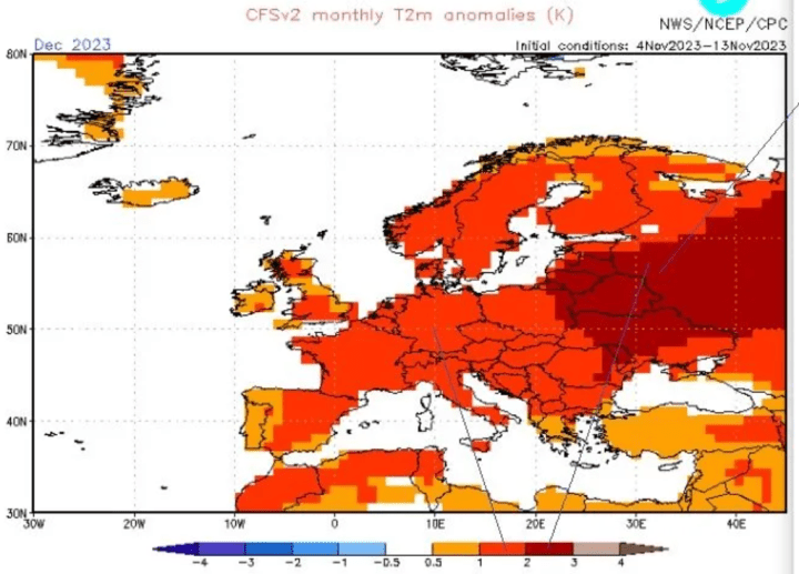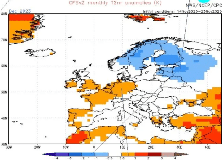 The NOAA’s latest GFS run has substantially cooled the temperature outlook for December. In its earlier projection, it saw December in Europe coming in 1 to 2°C warmer than the long-term mean: