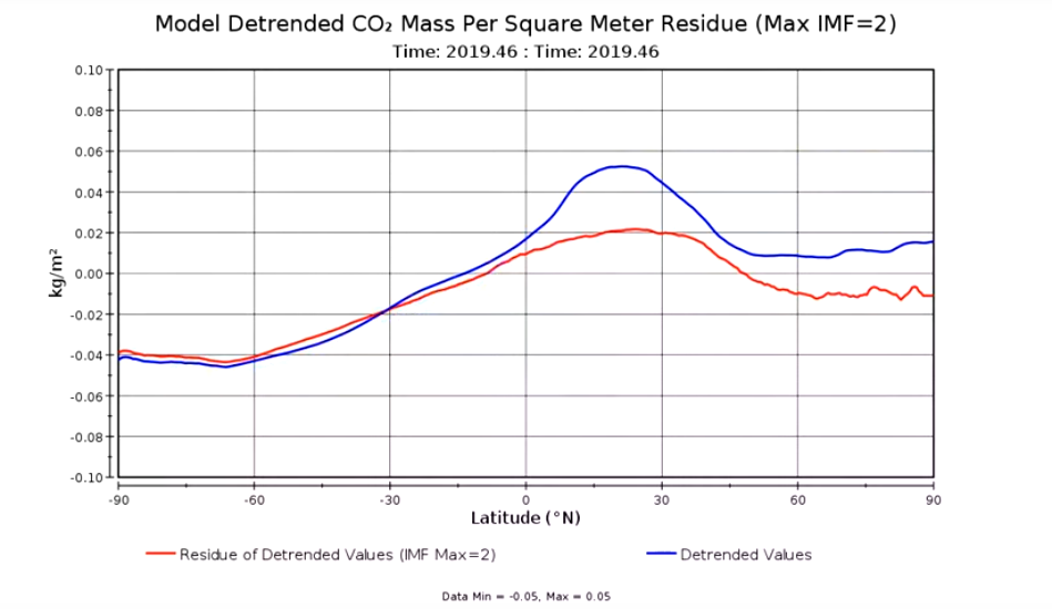 The next step was to take this simple model of CO2 growth and assume that it is evenly distributed across the globe. This was then used as the model to detrend the data, to see where the CO2 sources and sinks reside. This detrended data also has a lot of seasonal variability, which still tends to obscure things. However, you can do a sort of spectral analysis of this data, and the method I applied was the Hilbert-Huang transform. This decomposes a time series into a series of intrinsic model frequencies (IMFs), along with a low frequency “residue”. When you do this exercise over the 84 months of the detrended data, you find that grid cells have a minimum of 2 IMFs and a maximum of 6 IMFs. Places like Siberia and regions around the Arctic tend to have large numbers of IMFs, while Antarctica and the Southern Ocean tend to only vary slowly, resulting in few IMFs. In the following video, I show the results of plotting latitude averages of the detrended data, along with the detrended data minus the first two IMFs, i.e., residues with a maximum IMF value set to two.