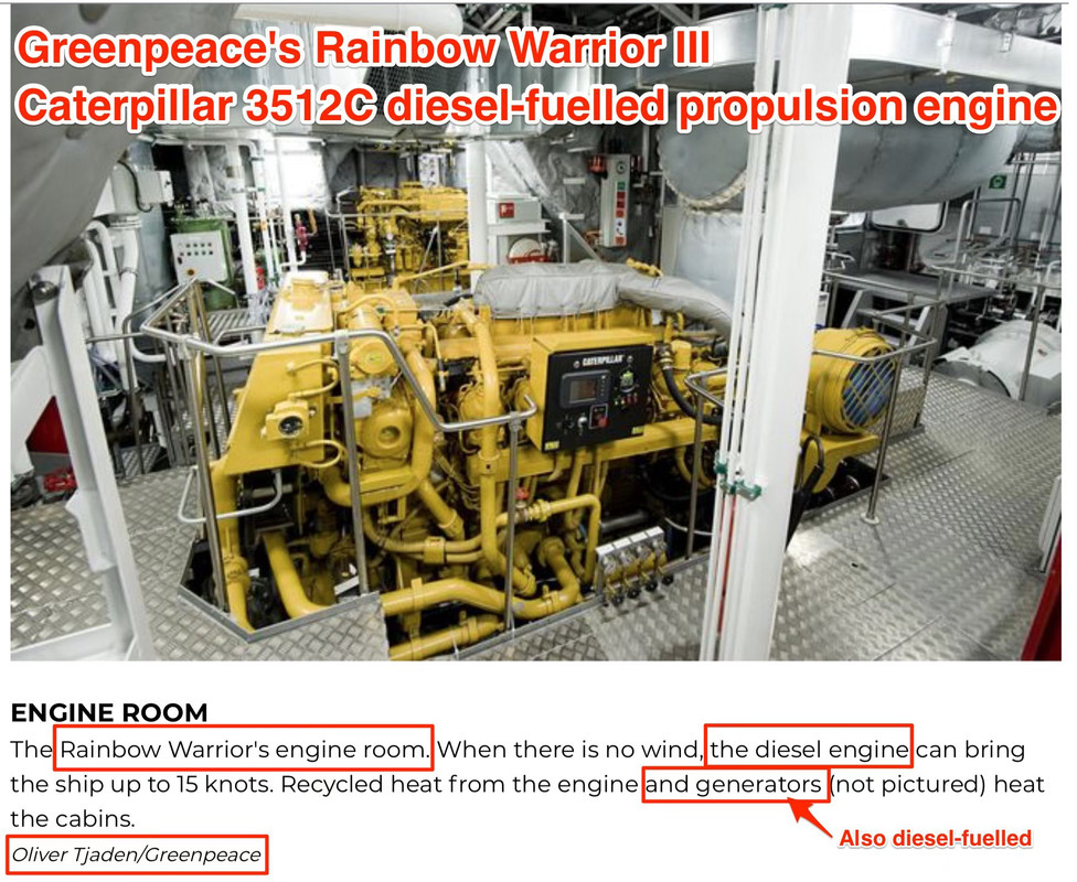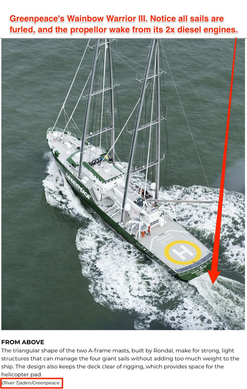 Joe ==> Yes, like most sailors, they probably motor 80% of the time. And like all the best mega-yachts (of which this is one, btw) they just MUST have a heli-pad…to bring in the millionaire funders for a weekend of eco-terrorism.