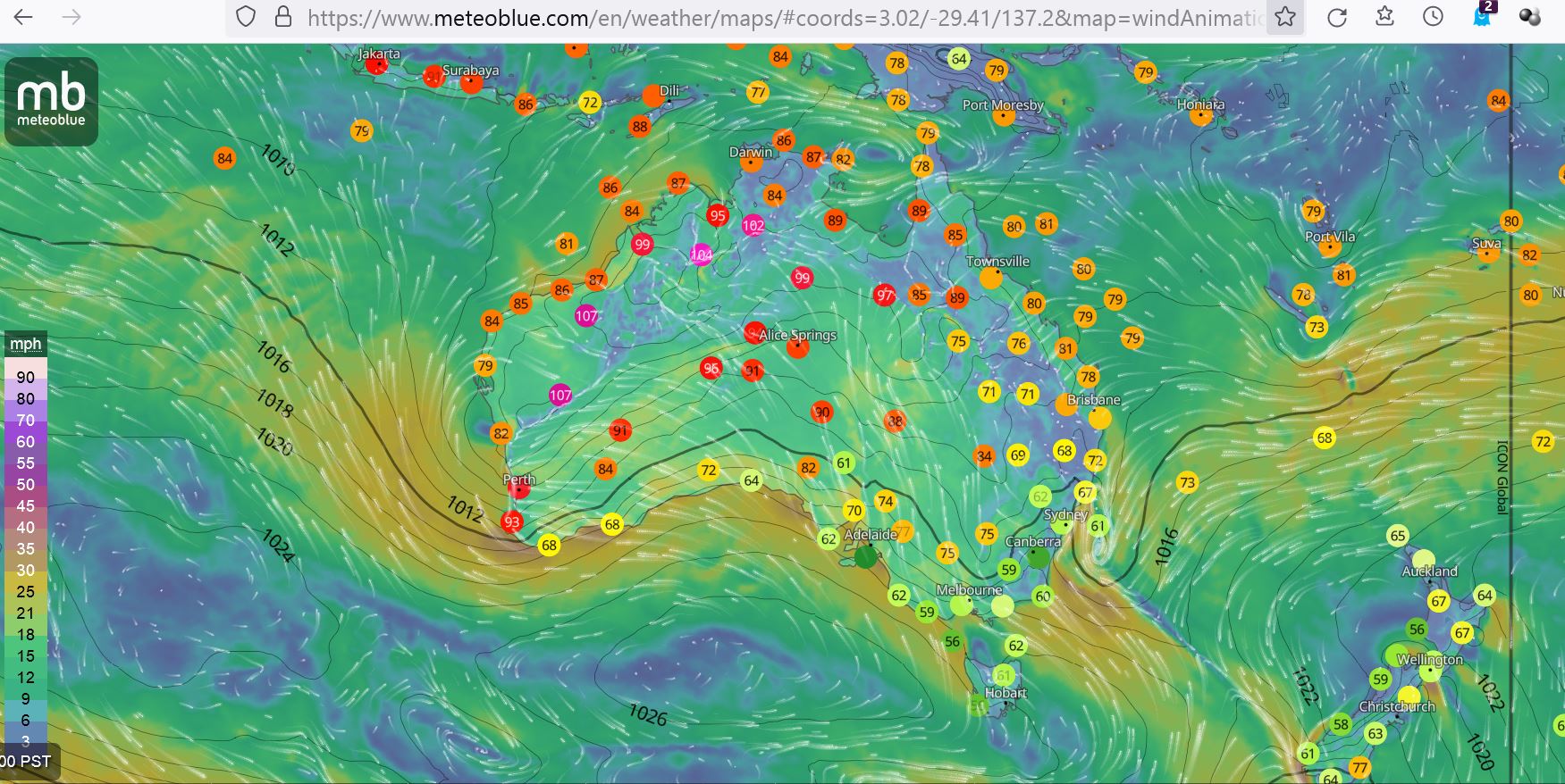 See now how barometric pressure has plummeted (about 1008 over Alice Springs where less than 1013 is your ‘tipping point’) and that has triggered a tsunami of warm moist air off the ocean from nearly all around Australia.