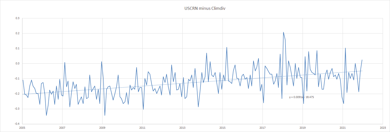 Try taking the difference between the two, and watch as Climdiv, which was a bit higher in 2005, has gradually been brough closer to matching USCRN.