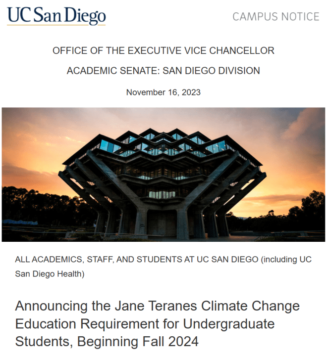 Continuing the transformation of universities from education to indoctrination centers, the University of California, San Diego, has announced the Jane Teranes Climate Change Education Requirement (JTCCER) for incoming first-year students, starting fall 2024. This requirement, approved by the Academic Senate, is a clear example of the university’s shift from fostering critical thinking to promoting a singular ideological agenda.