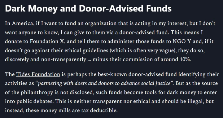 - The dark money, non-transparent, donor-advised funds should be made illegal (or at least not tax deductible).