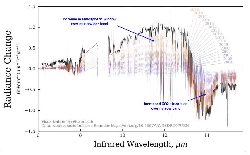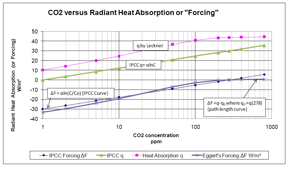 “One begins with an atmosphere that has a pre-induttrial value for CO₂, and asks how much warming will be associated with a doubling of that concentration. It turns out that the warming is logarithmic in CO₂ (because the absorption bands of CO₂ are almost saturated, and absorption is associated with line wings), so that each doubling is associated with the same warming. The contribution is about 3.5W/m2, or of the order of 2% of the normal flux, and leads to warming of about 1°C.”