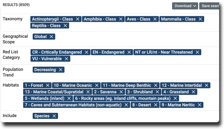 The Red List also lets us see if the populations of each species are increasing, stable, or decreasing.