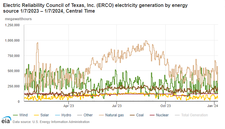 Texas grid, watts generated by energy source.