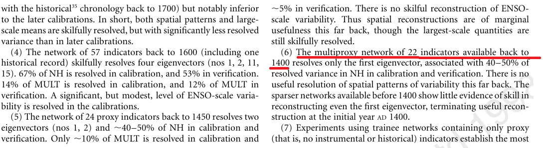 You are quoting the Abstract of McIntyre’s paper. But all it says is something about the intermediate PC1, and the issue of Gaspe cedars. The latter is not an issue of method; it is typical of McIntyre’s auditor approach. He said that 50-year data set to 1450 had 4 missing values (which Mann interpolated), so it has to go. Nothing else wrong with the data. But this is the opposite of science: