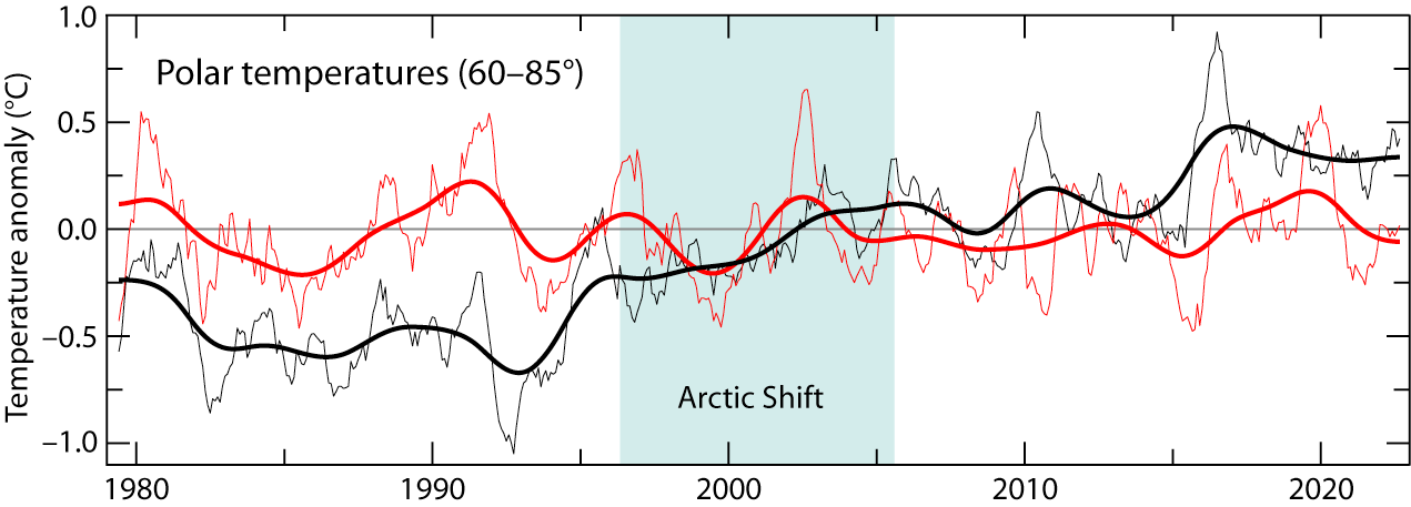 As regards the Arctic, Yes, of course there is a considerable effect of the major oceanic influx on the mostly shallow small pond of small thermal capacity that is the land surrounded Arctic ocean, with relatively low thermal capacity hence higher sensitivity to perturbations from serious oceans. The main ocean heat has strong effect at scale. As do any causes relative to the response to the same perturbation in the Southern hemisphere with double the ocean whci is most of the surface heat capacity. Obs.