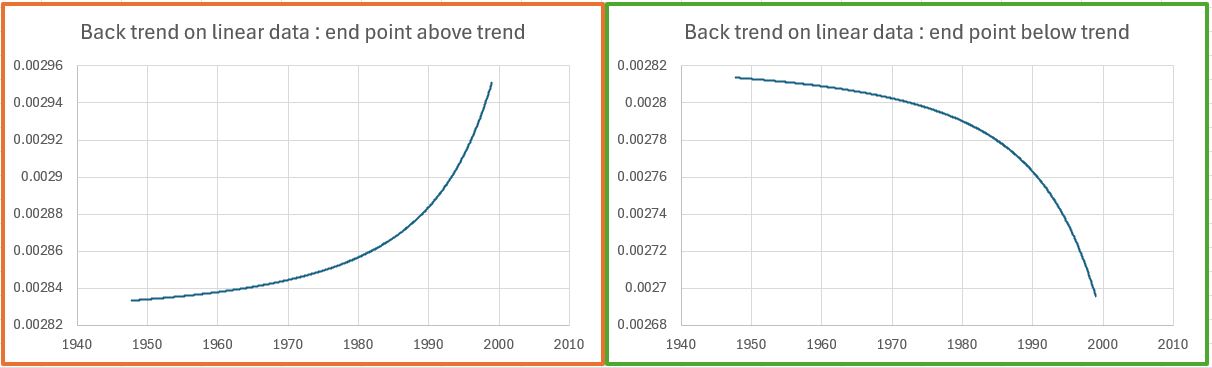 The same is true for extrapolations of y = mx + c regression fits, except these won’t oscillate.