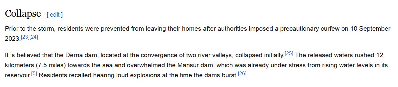 from the wiki:“”As recently as 2022, a researcher at the Omar Al-Mukhtar University in Bayda, Libya had warned in a paper that the dams needed urgent attention, pointing out that there was “a high potential for flood risk”. The paper also called officials to urgently carry out maintenance on the dams, prophetically stating that “(in) a huge flood, the results will be catastrophic”.
