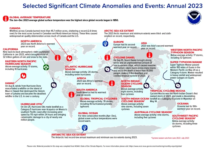 Of the 25 highlighted entries on NOAA’s “Selected Significant Climate Events” diagram 13 are related to cyclone and hurricane events across the various oceans of the Northern and Southern hemispheres that occurred during the year 2023.