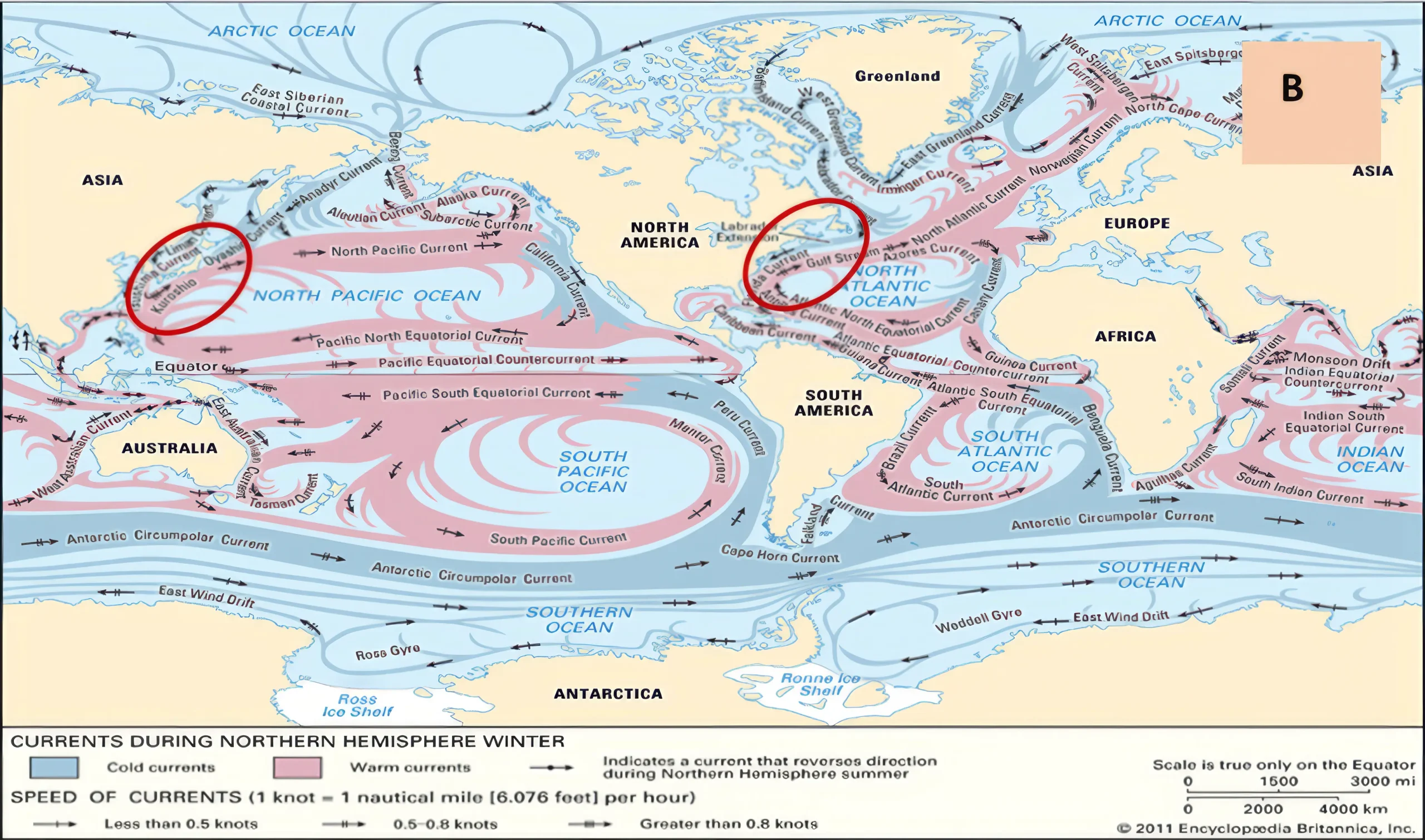 Although greenhouse theory describes rising CO2 as acting like a blanket across the globe that keeps more heat in the ocean, graphic A perfectly depicts asymmetric heating that we would expect from solar heating and ocean circulation (graphic B). The greatest increase in heat content happens along the east coasts (highlighted by red ovals), especially in the Kuroshio Current off Japan, and the Gulf Stream.