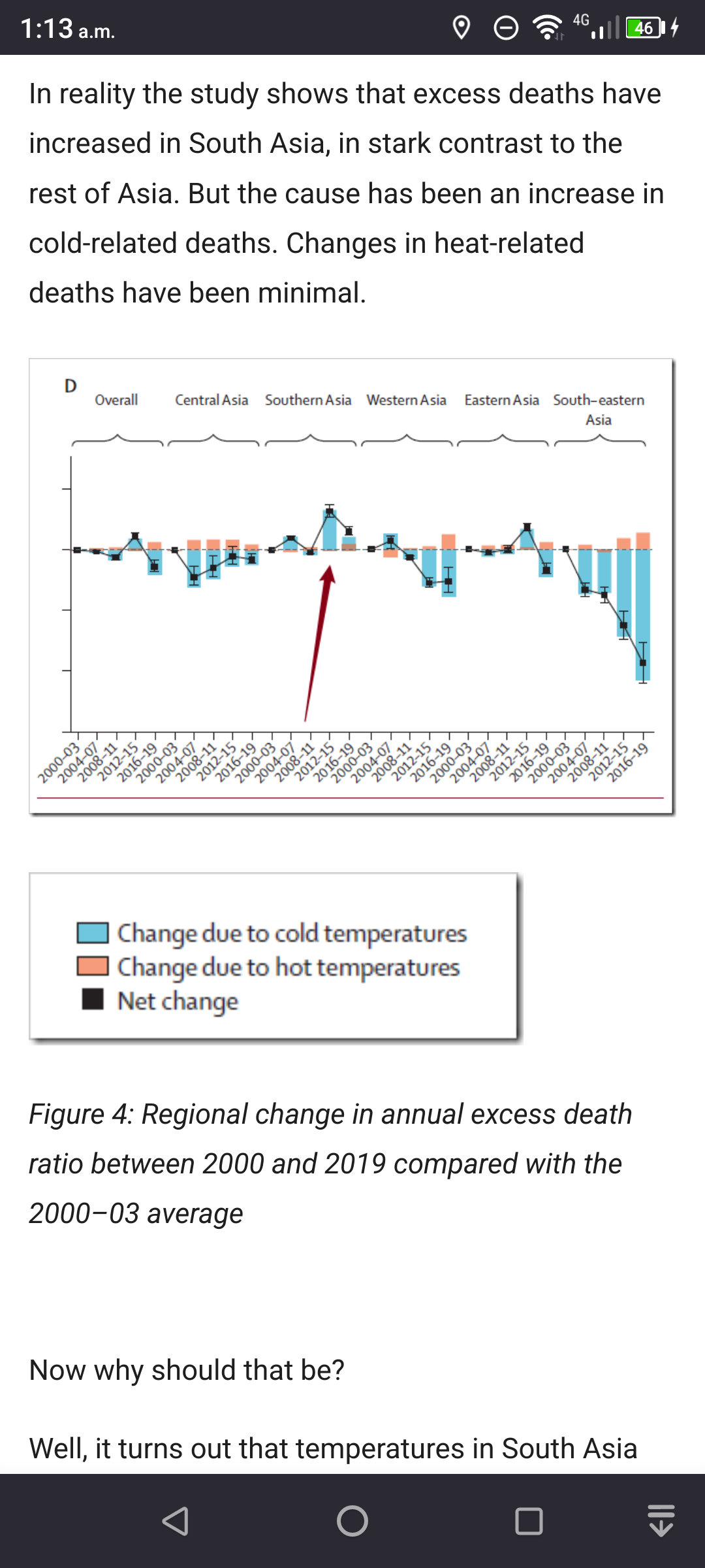 The graph shows the orange heat related deaths relatively unaffected by the years of warming but cold related deaths dropped by a lot – except in southern Asia because the temperature trend is reversed, it’s been getting colder there over the decades and cold related deaths have markedly increased.