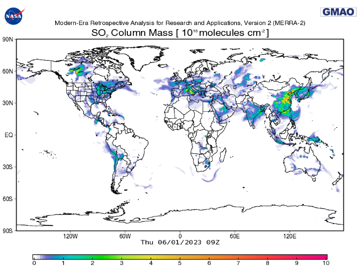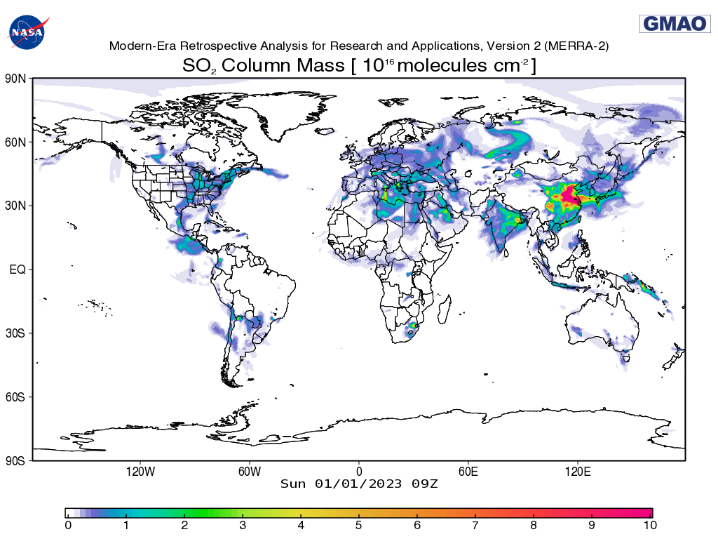 The following Chem Map images show the atmospheric loading of SO2 aerosols in Jan 1, 2020, and in Jan 1, 2023 (before the 2023 El Nino), showing the decreases due to Clean Air and Net Zero activities