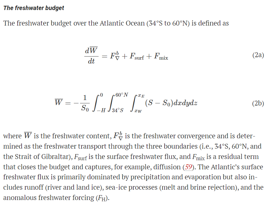 ” The AMOC is particularly sensitive to the ocean’s freshwater forcing, either through the surface freshwater flux (e.g., precipitation) or by input of fresh water due to river runoff or ice melt (e.g., from the Greenland Ice Sheet). “
