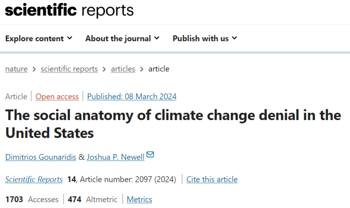 Climate change denialism persists in the United States, with estimates ranging from 12% to 26% of the U.S. population1,2. It is more pronounced in some states and regions3. Reasons for this denialism are multifaceted: Political affiliation and ideology, income, education, and exposure to extreme weather events are all important factors4,5,6. Denialism is more prevalent where local economies are highly dependent on fossil fuels7, in rural communities, and in populations where mistrust in science is pronounced8,9. Social media reaches millions of users, providing a key mechanism for influencers to spread misinformation10. The ability of social media to influence and harden attitudes was apparent in the response to COVID-19 vaccines11.
