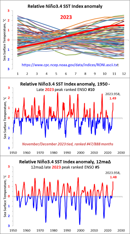 “The relative Niño3.4 index is now included in ENSO monitoring, which is defined as the conventional Niño3.4 index minus the SSTA averaged in the whole tropics (0°-360°, 20°S-20°N), in order to remove the global warming signal. Also, to have the same variability as the conventional Niño3.4 index, the relative Niño3.4 index is renormalized (van Oldenborgh et al. 2021: ERL. 10.1088/1748-9326/abe9ed: L’Heureux, et al. 2024: J. Climate. 10.1175/JCLI-D-23-0406.1).” -CPC ENSO advisory