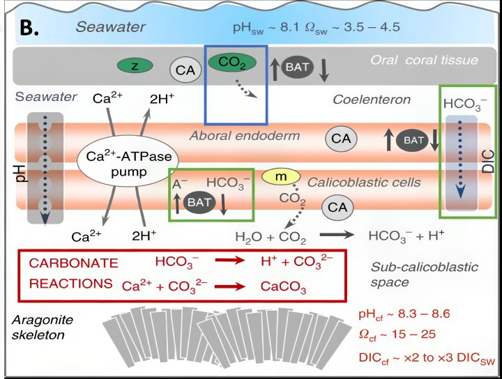Instead, the researchers propose a model where the corals pump calcium and carbonate ions from seawater through coral tissue, which concentrates those minerals near the skeleton. Importantly, this control allows corals to regulate their internal ion concentrations, even as oceans acidify due to rising carbon dioxide levels.