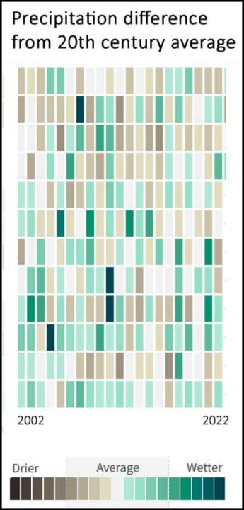 There are not many “wettest” months (darkest green) and visible but not obvious is that 2021 had a wet summer (four greens stacked up).