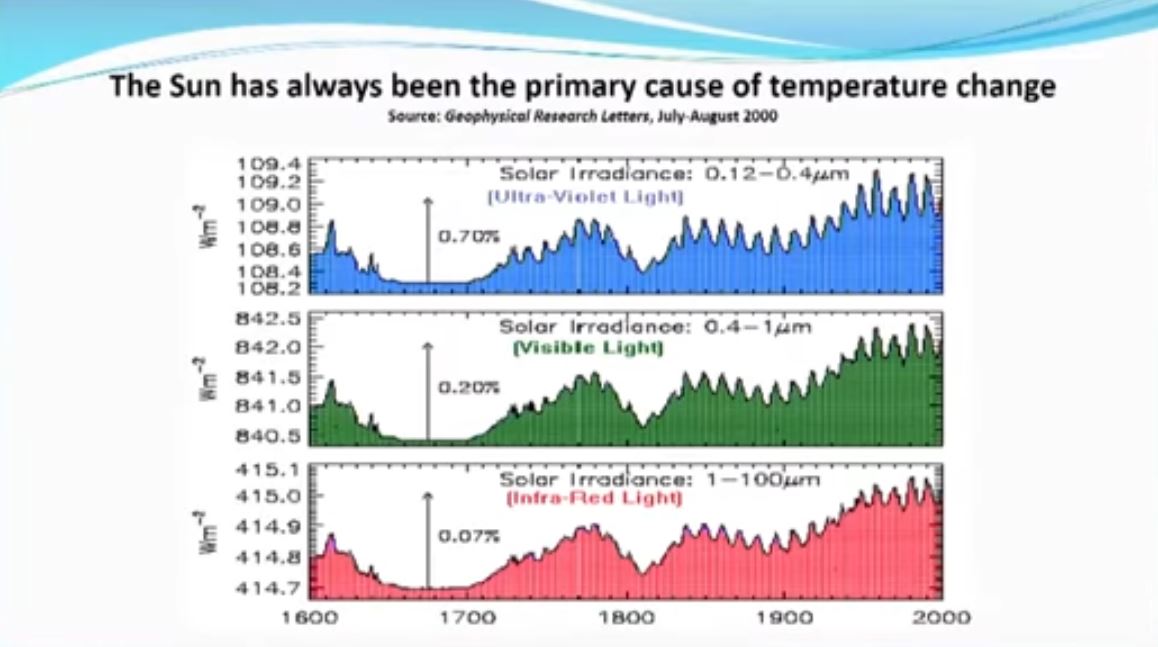 This is where it gets confusing – he says that the rural stations show no warming, urban heat is to be ignored BUT, is still looking for warming via sunspots, cosmic rays, total irradiance and any/all other solar happenings.