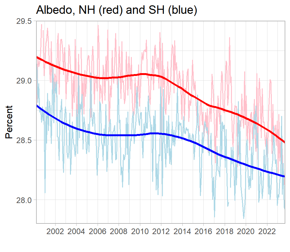 Figure 2. Net solar irradiation that reaches Earth, watts/m2, calculated as incoming solar radiation minus reflected shortwave radiation. Seasonally adjusted monthly averages for each of the hemispheres. Thick lines are Loess smooths, March 2000 – September 2023. Data: Ceres Ebaf4.