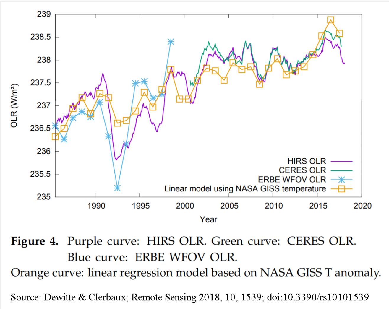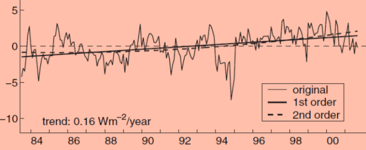 We have thus had an increase in net solar radiation over the period of approximately 1.3 W/m2 according to the Ceres data. The long-term positive trend in shortwave radiation has been confirmed to exist since 1983 (with other satellite data).[2] That there is an established trend for 40 years makes it climatologically significant.