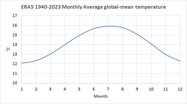 Solar irradiance is 6% weaker in July than in January due to orbital considerations. Now get this! Paradoxically, the temperature of the globe peaks when solar irradiance is weakest. A 5.7% decline in albedo between January and July compensates for the 6% deficit in solar radiation and on top of that, delivers the thumping 2.5°C benefit by comparison with the southern hemisphere.