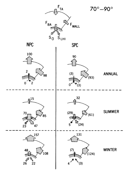 The attached charts are for 70-90 deg, north and south. In terms of net outgoing radiation, the North Pole sends out the most, and most of that output is in the winter.