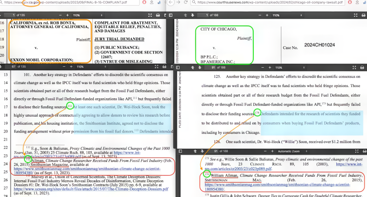 ✓ “Bankroll” / “paid” / “funded scientists” – Sher Edling was very consistent from San Mateo County v Chevron in 2017 to October 2022 in Platkin v Exxon, regarding the use of the word “bankroll” to accuse skeptic climate scientist, Dr Willie Soon, of being industry-corrupted. When it came time for Sher Edling to file their September 2020 Delaware v BP lawsuit, however, they needed to switch their Smithsonian Institution press release citation source for the accusation to an Internet Archive version because the Smithsonian had taken their page about Dr Soon offline – Sher Edling continued using the Archive link through to their Platkin filing, and while their Dec 2023 Indian Tribes twin filings swapped the word “paid” for “bankroll,” the archive Smithsonian press release page citation remained. The Smithsonian Institution never said he was “paid” or “bankrolled” by any fossil fuel company, they simply stated they were beginning to look into whether there was a problem with his funding disclosures.