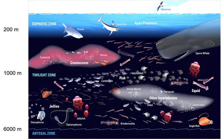 The organic matter produced in the ocean’s sunlit surface layers gradually sinks. As the organic matter is consumed, oxygen is consumed, and CO2 is released. Virtually all that organic matter is consumed by the 1000-meter depths, explaining why oxygen reaches its lowest levels by 1000 meters. All that sinking matter feeds the abundant marine life in what is known as the twilight zone, the 200 to 1000-meters depths that lacks enough light for photosynthesis. Scientists now estimate that 90% of the oceans’ biomass lives and feeds in the twilight zone, fed by organic matter produced by photosynthesis in the warmest surface layer.