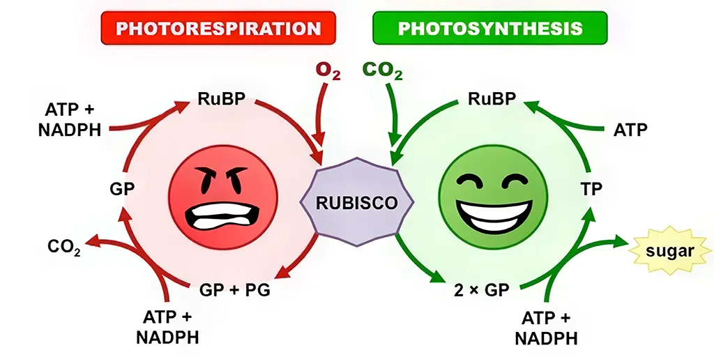 As carbon dioxide concentrations rise, the rate at which sugars are made by the light-independent reactions increases until limited by other factors. RuBisCO, the enzyme that captures carbon dioxide in the light-independent reactions, has a binding affinity for both carbon dioxide and oxygen. When the concentration of carbon dioxide is high, RuBisCO will fix carbon dioxide. However, if the carbon dioxide concentration is low, RuBisCO will bind oxygen instead of carbon dioxide. This process, called photorespiration, uses energy, but does not produce sugars.