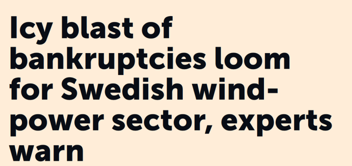 Since the economists’ initial findings, Markbygden Ett, Sweden’s largest wind-farm installation with 179 turbines, is already facing bankruptcy, stacking up hundreds of millions of krona in debt.