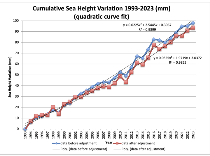 Francis, A few comments (although I agree with most of the post) – I think you meant to say the quadratic fit is above the data (not the linear). And the reason the acceleration is different is that this data goes to 2023 and the Nerem paper was in 2018.
