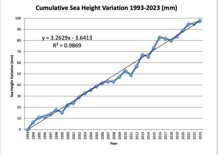 Bill then commenced an email correspondence with a guy name Josh Willis at NASA. He asked Willis whether there was any reason to try to fit a parabola to these data, rather than just a straight line, to which he got the response “A linear fit is not a ‘simpler’ explanation, it is an incomplete one. The acceleration is real, and there is no justification for ignoring it.” Note that Willis has no basis for claiming that the acceleration “is real” other than the data, which are the same data that you and I can look at. Willis then referred Bill to the Nerem, et al., paper. But Bill pointed out that Nerem, et al., claimed an acceleration of 0.084 mm/yr^2, whereas the NASA data as of February 2024 at best would only support an acceleration rate of 0.045 mm/yr^2. Bill remarks, “Josh must have found this to be a troubling contradiction because soon after he indicated that he preferred our correspondence cease.”