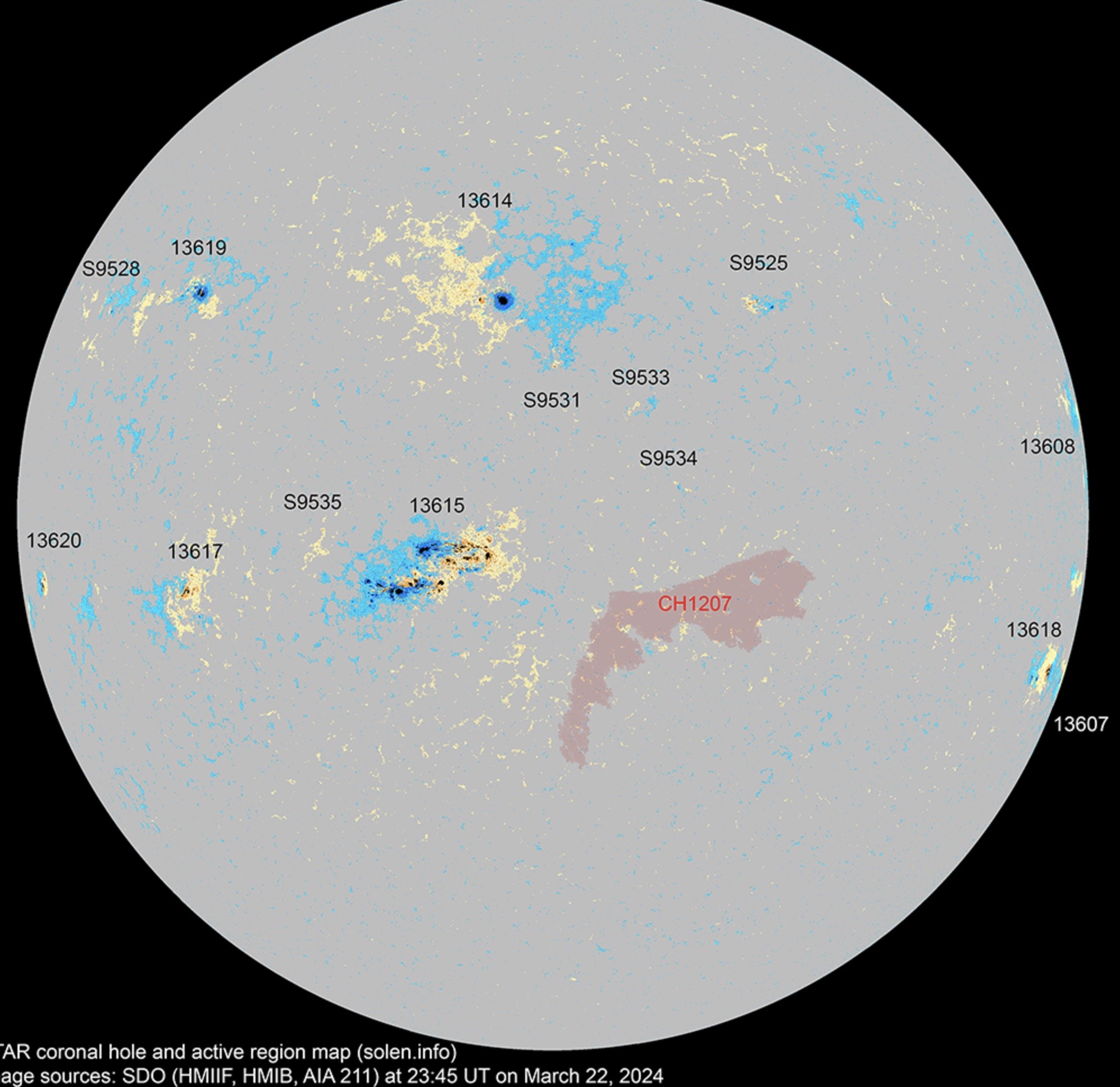 R3 (Strong) levels were reached on 22 March, 2024. The flare activity began from Region 3614 (to the north), and was still in progress when another flare erupted from Region 3615 (to the south). It’s tough to say with certainty at this point which flare was the source of R3 level