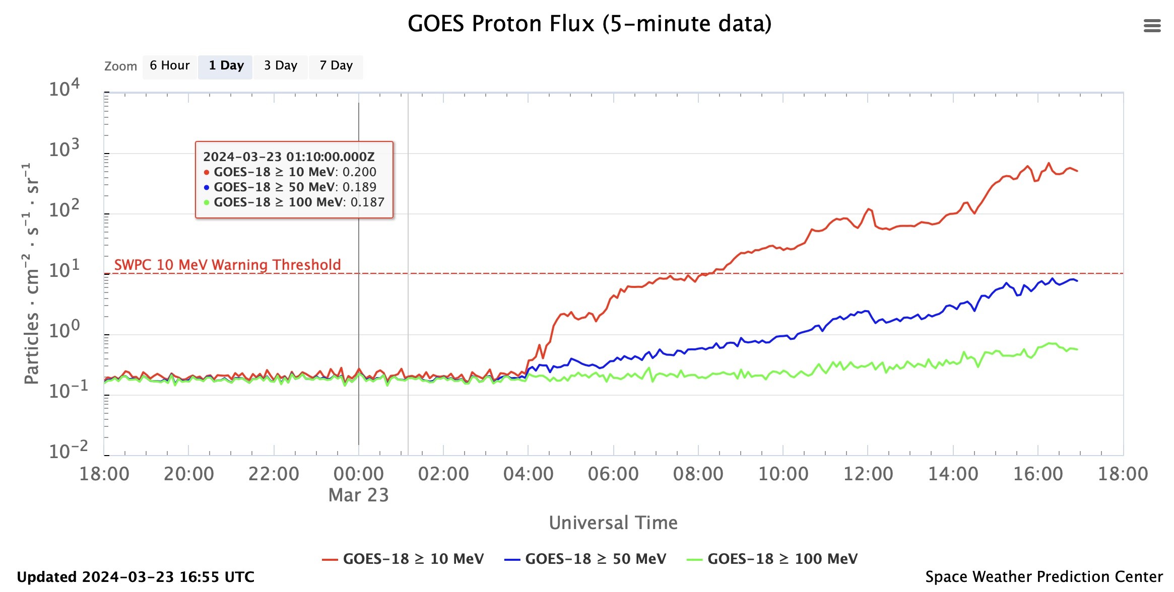 As of noon 12 CDT, proton flux has the solar radiation warning level at S2, moderate level, effects: