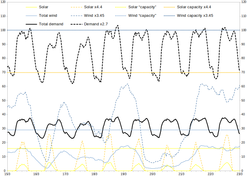 The dashed lines are a simple “linear scaling” assuming future “nominal / nameplate / faceplate” capacities of 70GW of solar + 100GW of wind.