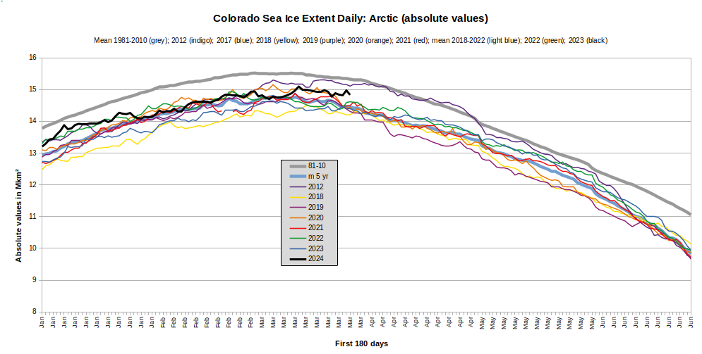 Here are Arctic sea ice extent’s first 180 days in absolute form for the most recent years, the mean for 2019-2023 and… 2012: