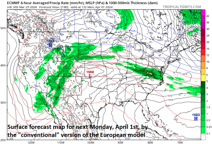 Surface forecast map for next Monday, April 1st, made by the 00Z “conventional” version of the Euro model; Map courtesy ECMWF, tropicaltidbits.com