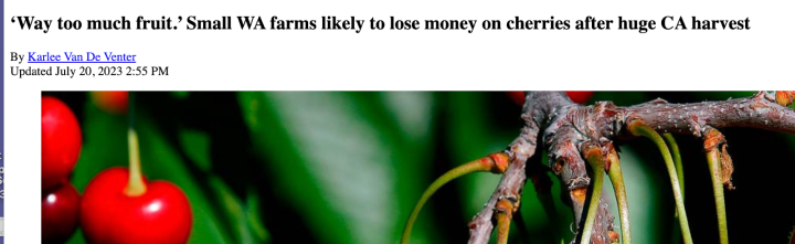 It turns out the truth was a bit different. The Washington State cherry crop was very large and high quality. The problem was the cool, wet weather resulted in a bumper, late crop in California that suppressed prices.