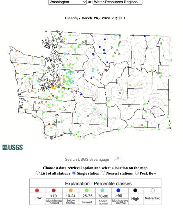 Maybe not. The streams on the “dry” eastern slopes of the Cascades are running high (see below). Nearly normal streamflow conditions on the western slopes of the Cascades. The only streams running low are around the South Sound area.