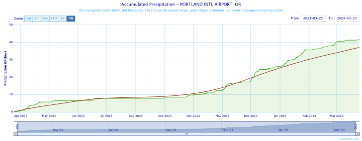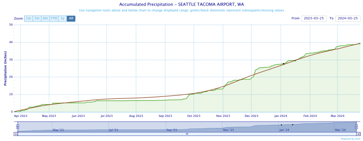 Two weeks ago, Seattle rain fall, which I check every day, was slightly ABOVE average since 01 OCT 2023 (the first month of our rainy season) and slightly ABOVE average since 01 JAN 2024 (the start of our annual rain fall number).