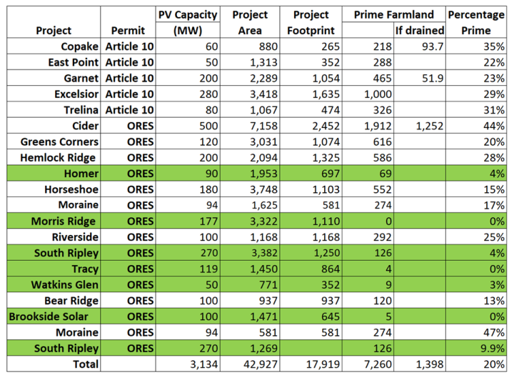 In their comments for solar project applications the Department of Ag and Markets prepared testimony has noted that “The Department’s goal is for projects to limit the conversion of agricultural areas within the Project Areas, to no more than 10% of soils classified by the Department’s NYS Agricultural Land Classification mineral soil groups 1-4, generally Prime Farmland soils, which represent the State’s most productive farmland.” The lack of a responsible solar implementation policy has meant that of the 20 projects with applications only seven meet this criterion as shown in my Solar Project Scorecard. These results show that it is possible to protect prime farmland, but that New York State has failed to mandate that all projects meet the reqirement. As far as I can tell, there are no provisions in any of the permitting requirements that mandate farmland protections consistent with Department of Ag & Markets recommendations.