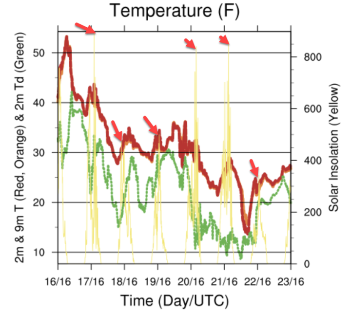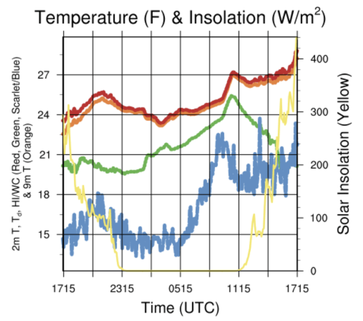 Here is a graph of the temperature (red, orange), dew point temperature (green), and solar insolation (yellow) over the last seven days ending 23 March 2024 at 16Z or Noon EDT. Regrettably the parameter of interest is in yellow.