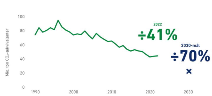 Denmark’s progress with the climate targets, 1990-2022, in million tons of CO2-equivalents per year.